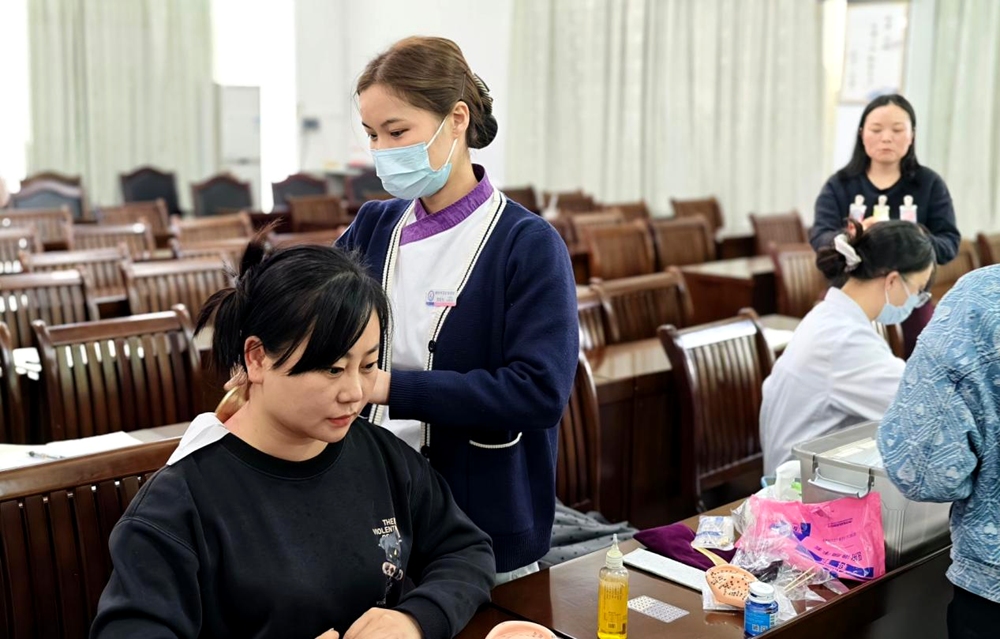 图为妇幼保健院医生为中心女职工开展刮痧理疗