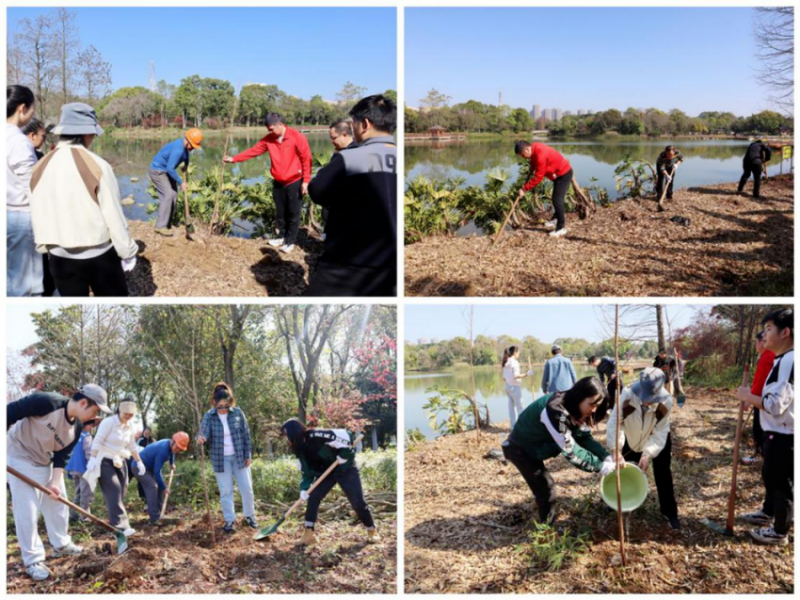 在实操植树环节,志愿者们热情高涨、分工协作,在专业技术人员的指导下挥锹挖坑、扶正树苗、填土压实、提水浇灌,每一个步骤都认真细致、有条不紊。尽管鞋子沾满泥土,汗水浸湿衣衫,但看着阳光下迎风挺立的树苗,大家的喜悦与自豪溢于言表。