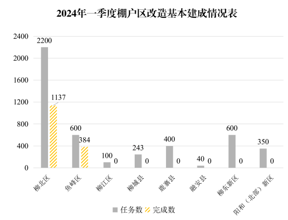 2024年,自治区预下达柳州市棚户区改造基本建成目标任务4000套。截至2024年3月31日,全市共有6个项目、1521套达到基本建成标准。其中,鱼峰区(完成率64%)、柳北区(完成率51.68%)等城区建设进度较快,柳江区、鹿寨县、柳城县、柳东新区、阳和(北部)新区等县区(完成率均为0%)建设进度较慢,融安县长安镇城东市场片区棚户区改造项目、鹿寨县城南新区城中村改造项目(大、小龙田屯)等项目尚未达到基本建成标准。