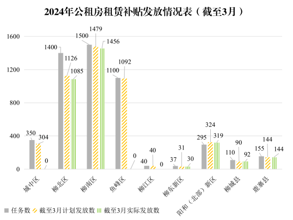 2024年,自治区预下达柳州市公租房租赁补贴发放目标任务4987户。截至2024年3月31日,实际发放3126户,完成年度目标任务的62.68%。其中,阳和(北部)新区(发放率108.14%)柳南区(发放率97.07%)、鹿寨县(发放率92.9%)等县区发放进度较快,城中区、鱼峰区、柳江区等城区(发放率均为0%)发放进度较慢。