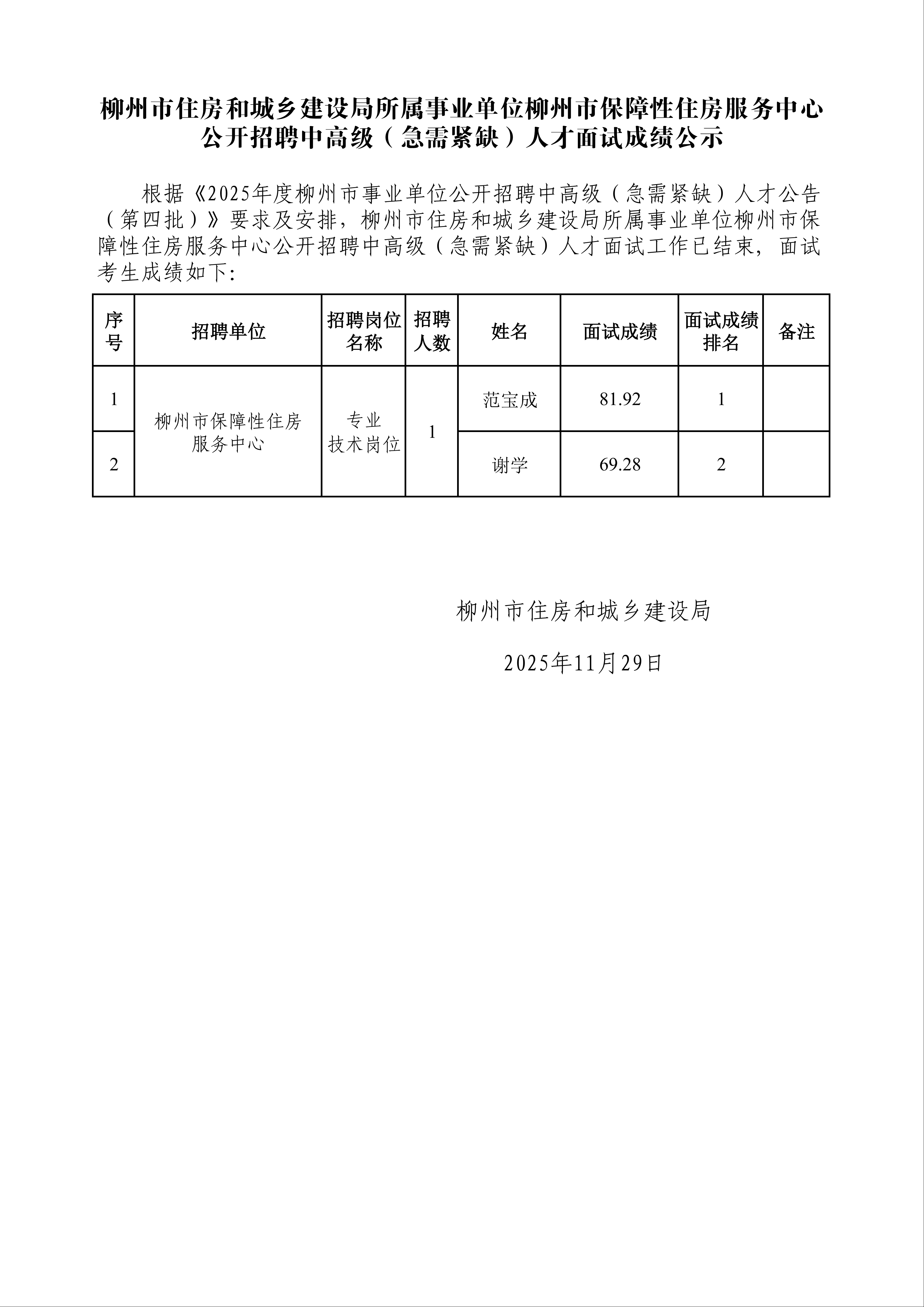 柳州市住房和城乡建设局所属事业单位柳州市保障性住房服务中心公开招聘中高级(急需紧缺)人才面试成绩公示